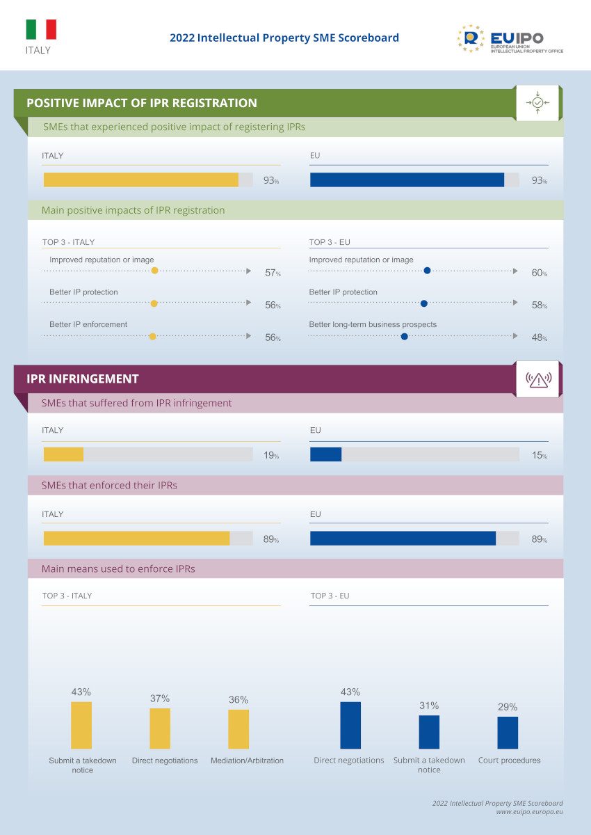 Tuttavia, la scheda di valutazione delle PMI per il 2022 indica anche che quasi tutte (93 %) le PMI con diritti di PI registrati hanno rilevato un impatto positivo sulla loro attività.