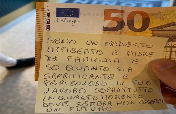 Sulla banconota era anche allegato un messaggio: “Sono un modesto impiegato e padre di famiglia e so quanto sia sacrificante e pericoloso il tuo lavoro soprattutto in questo momento dove sembra non esserci un futuro”.