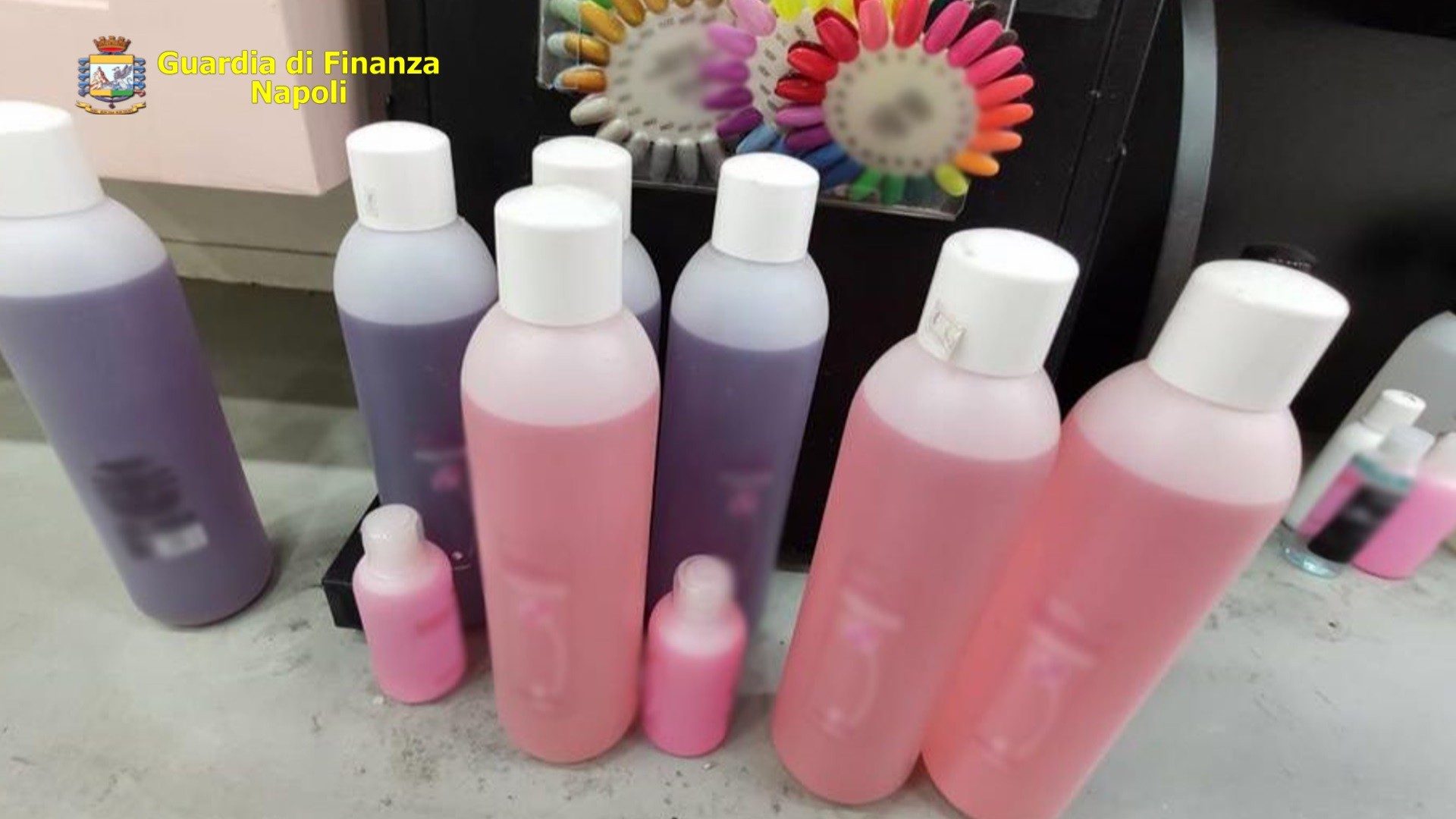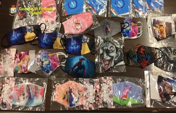 In particolare sono stati sequestrati 11.600 articoli contraffatti, tra cosmetici e mascherine facciali del calcio Napoli e vari personaggi di Walt Disney, etichette adesive Swarovski, 65 litri di diluenti, additivi e prodotti industriali per la cosmetica.