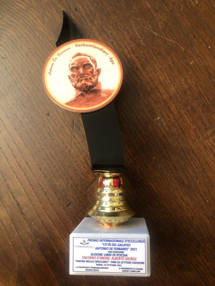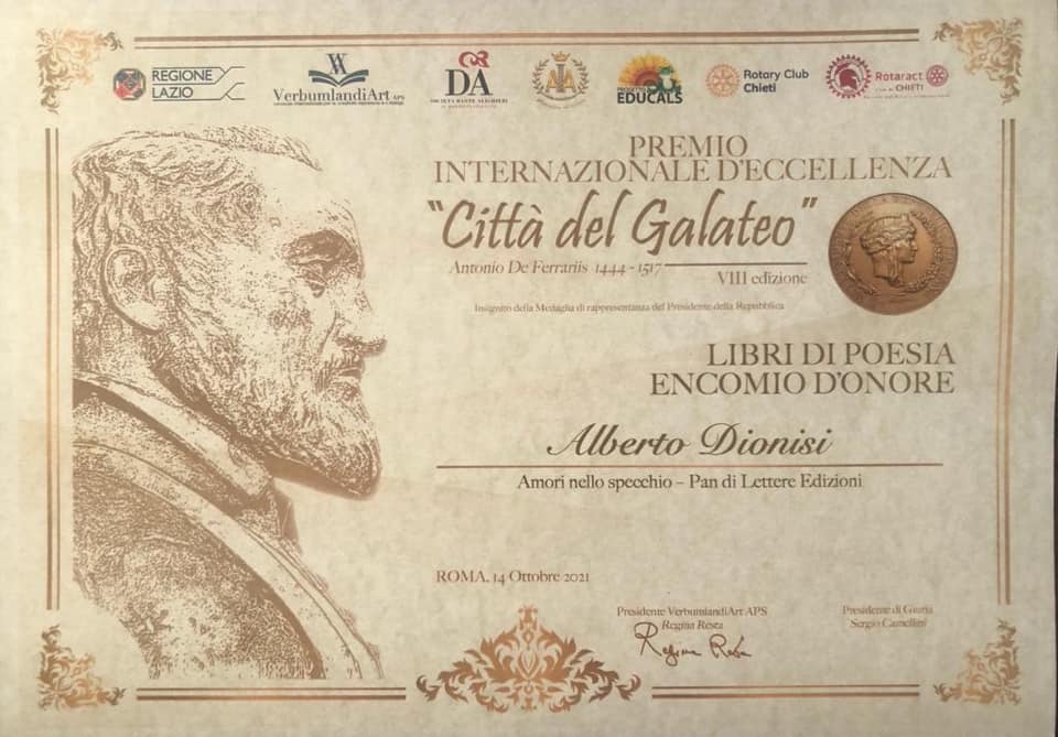 E’ stato premiato con un encomio d’onore per il suo libro di poesie, ‘Amori nello specchio’, all’VIII edizione del premio internazionale d’eccellenza Città del Galateo.