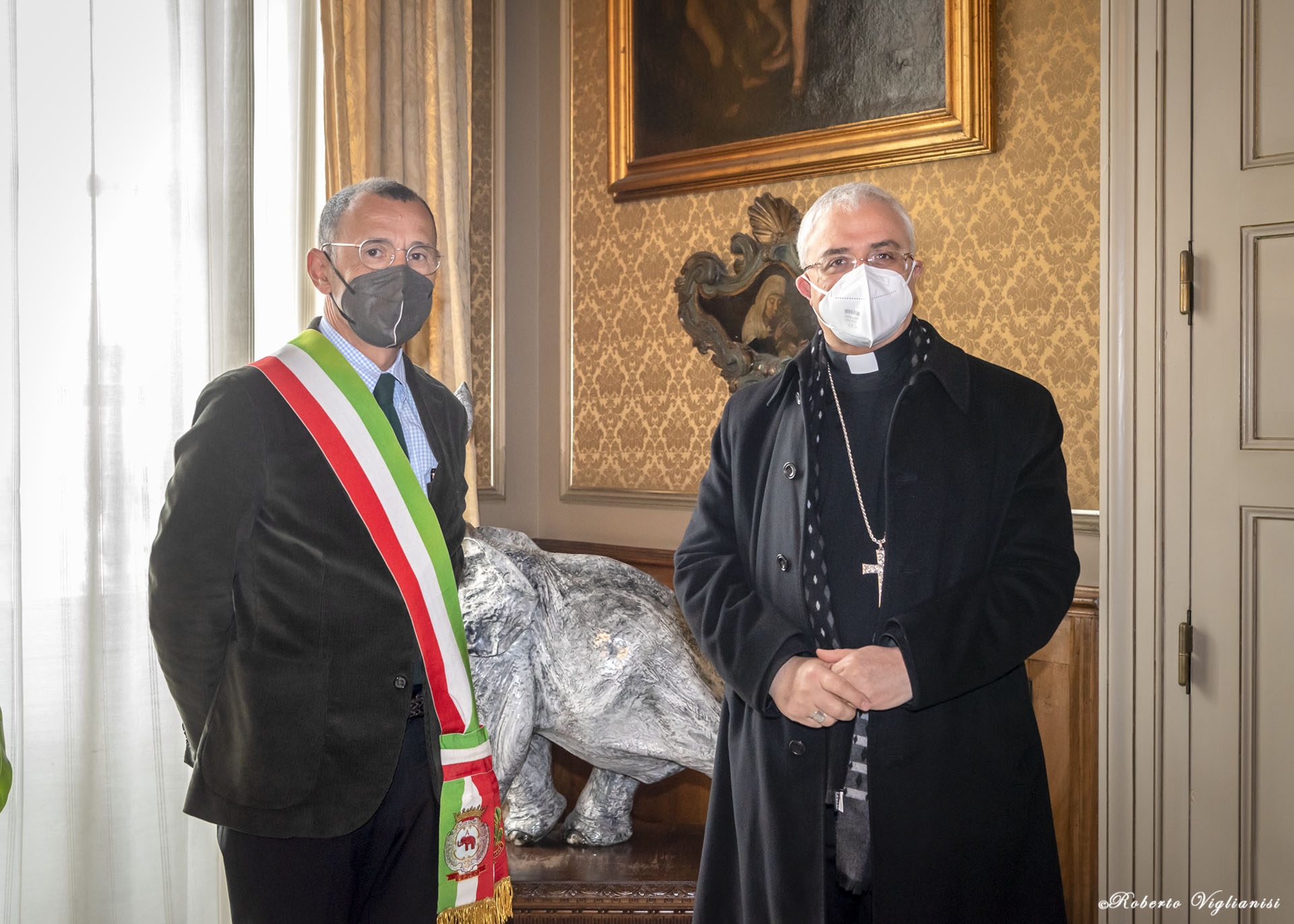 Dopo un breve colloquio riservato con il sindaco facente funzioni Roberto Bonaccorsi, Mons. Renna ha incontrato tutta la giunta comunale: ”Rivolgo tramite voi – ha detto l’Arcivescovo – un’esortazione a tutta la città a impegnarsi per il bene comune, non soltanto nei giorni di festa ma nella vita quotidiana per migliorare la vita delle nostra comunità. La Politica e l’Amministrazione della cosa pubblica hanno un ruolo di straordinaria importanza per la vita civile. E’ un momento particolarmente delicato che vi chiama a una grande responsabilità”.