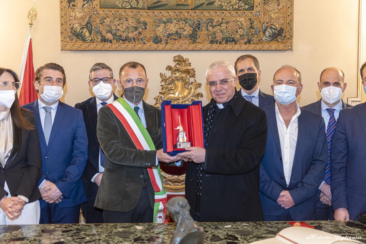 A conclusione della visita, Bonaccorsi, a nome della giunta e dell’intera città ha donato all’Arcivescovo un elefantino d’argento, simbolo di Catania e interprete della forza resiliente dei catanesi.