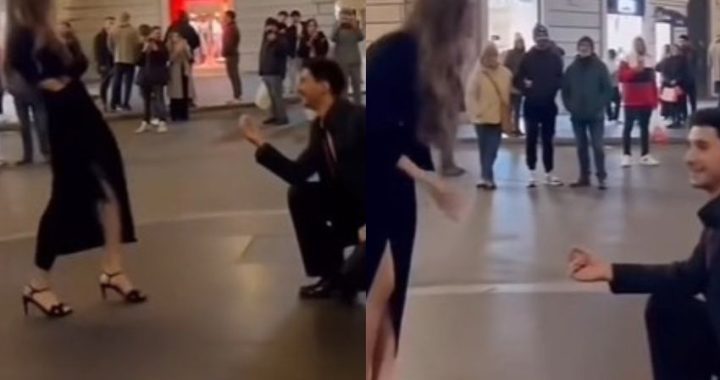 L’episodio surreale ha avuto luogo in Largo Carlo Goldoni a Roma, dove un ragazzo ha invitato la sua fidanzata a ballare sulle note di “‘O sole mio”, per poi inginocchiarsi e farle la fatidica proposta mostrandole l’anello. Lei imbarazzata dice: “Ma che c***o fai” e già questa reazione ha subito smorzato quell’alone di romanticismo che aleggiava sulla coppia.