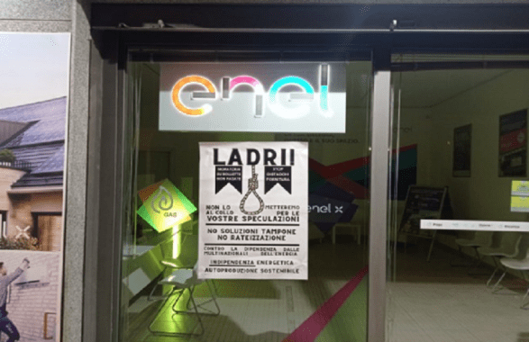 In Sicilia prosegue la protesta per il caro bollette e sulle sedi dell’Enel dell’Isola campeggia la scritta “Ladri!” assieme a tanti manifesti oltre che di protesta anche di richiesta della moratoria sulle bollette e dell’interruzione dei distacchi della luce.