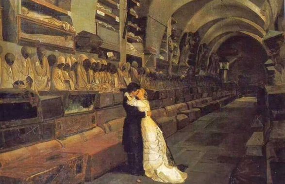 Lo strano dipinto che raffigura due giovani intenti a baciarsi all’interno delle Catacombe dei Cappuccini di Palermo: ”Amore e Morte” del pittore catanese Calcedonio Reina.