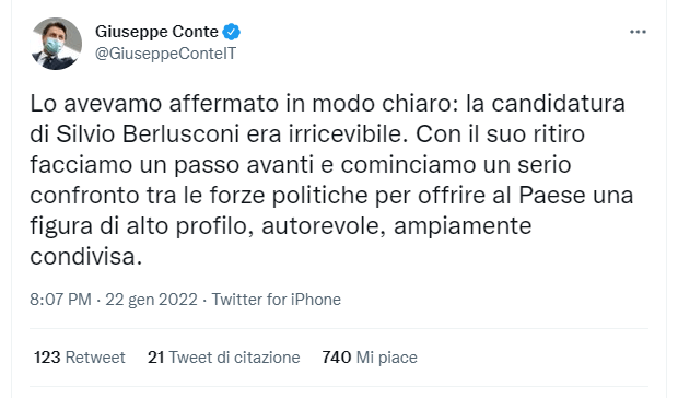 “Lo avevamo affermato in modo chiaro: la candidatura di Silvio Berlusconi era irricevibile. Con il suo ritiro facciamo un passo avanti e cominciamo un serio confronto tra le forze politiche per offrire al Paese una figura di alto profilo, autorevole, ampiamente condivisa”. Ha scritto su Twitter il presidente del M5S, Giuseppe Conte.