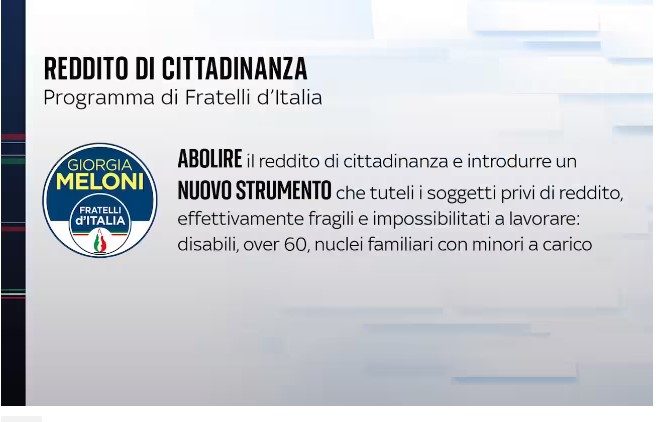 La posizione di FdI è stata chiarita da subito nel programma presentato prima delle elezioni che prevede l’abolizione del reddito di cittadinanza e l’introduzione di un nuovo strumento che tuteli i soggetti privi di reddito, effettivamente fragili e impossibilitati a lavorare: disabili, over 60, nuclei familiari con minori a carico.