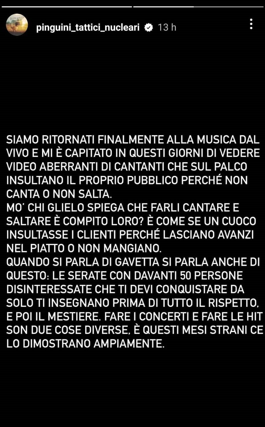 La risposta a Rhove dei Pinguini Tattici Nucleari, sempre in una storia Instagram, non si è fatta attendere ed eccola riportata integralmente con riferimenti alla gavetta e alla conquista di un pubblico disinteressato: “Siamo ritornati finalmente alla musica dal vivo e mi è capitato di vedere video aberranti di cantanti che sul palco insultano il proprio pubblico perché non canta o non salta. Chi glielo spiega che farli cantare e saltare è compito loro? Quando si parla di gavetta, si parla anche di questo: le serate con davanti 50 persone disinteressate che ti devi conquistare da solo, ti insegnano prima di tutto il rispetto. E poi il mestiere. Fare i concerti e fare le hit sono due cose diverse: e questi mesi strani ce lo dimostrano ampiamente”.