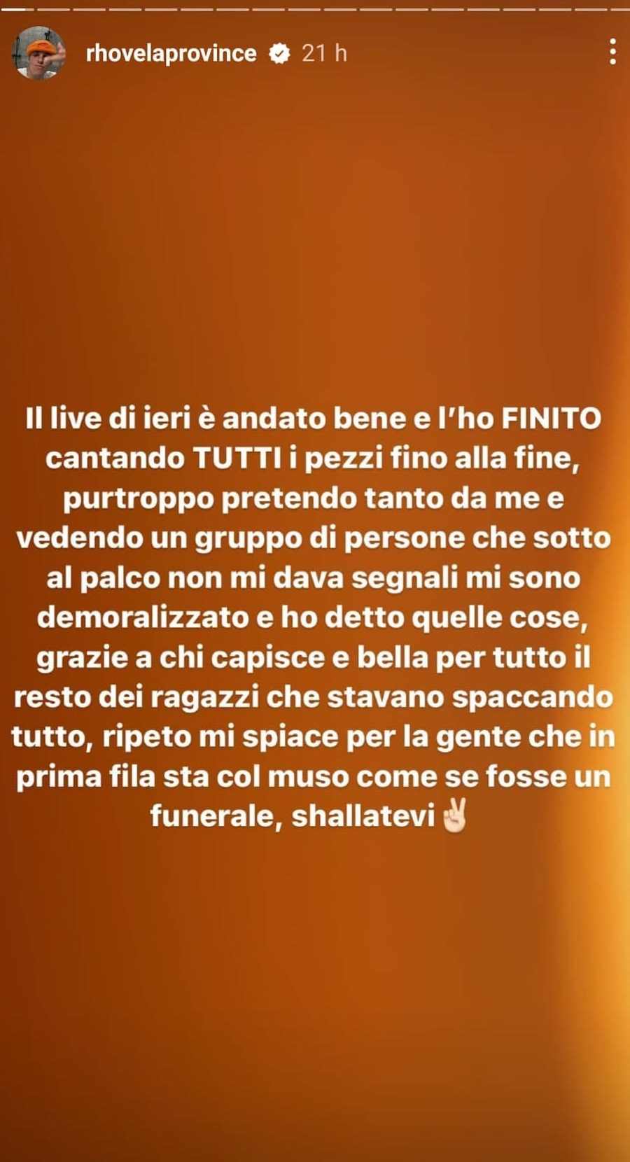 Ma questa particolarità delle esibizioni di Rhove non ha trovato finora un grande favore da parte del pubblico, che ancora non ha scoperto del tutto la sua fama, se non per la sua hit Shakerando. La sua rabbia comunque non si è fermata e dopo un concerto ha detto al pubblico le seguenti parole: “Mi son fermato perché un quarto di voi a fine concerto, non esiste che all’ultima canzone voi siate fermi: Dio Pera. Il concerto adesso è finito e voi non avete saltato un ca***, è un problema. Mi spiace, ma divertitevi un po’ di più”. I fischi del pubblico lo hanno comunque convinto a cercare un dialogo più pacifico e ragionevole con esso e su una storia Instagram ha scritto: “Il live di ieri è andato bene e l’ho finito, cantando tutti i pezzi fino alla fine. Purtroppo pretendo tanto da me e vedendo un gruppo di persone che sotto al palco non mi dava segnali mi sono demoralizzato e ho detto quelle cose. Grazie a chi capisce e bella per tutto il resto dei ragazzi che stavano spaccando tutto. Ripeto mi spiace per la gente che in prima fila sta col muso come se fosse un funerale, shallatevi”.