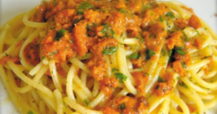 Aprite i ricci aiutandovi con l’apposito attrezzo o con un coltello, recuperate la polpa con un cucchiaino e trasferitela in una ciotola. Pestate l’aglio nel mortaio con una presa di sale, aggiungete il prezzemolo tritato finemente, l’olio e una spolverata di pepe nero. Mettete in una tegame questo composto, fate intiepidire e aggiungete la salsina alle uova di ricci facendo insaporire per non più di un minuto. Cuocete gli spaghetti al dente, scolateli e conditeli con il sugo preparato.