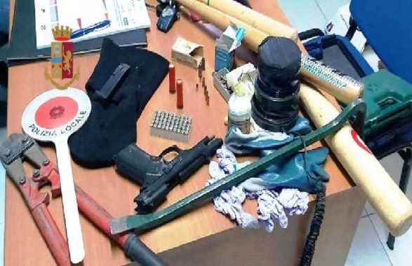 Tra le altre cose sono state rinvenute 91 cartucce di diverso calibro, una pistola semiautomatica replica priva del tappo rosso con matricola abrasa e completa di caricatore, 3 mazze da baseball, una palina segnaletica con la scritta “Polizia Locale”, una cesoia spezzaferro, un piede di porco, un passamontagna ed un lampeggiante magnetico.