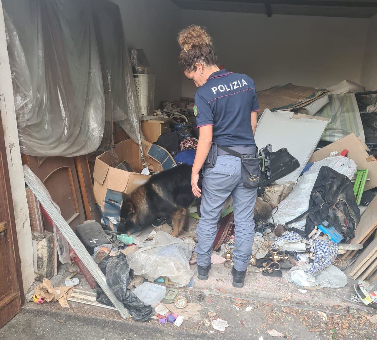 L’attenzione degli agenti della Polizia di Stato sul garage è stata sollecitata dal cane antidroga Ares che ha segnalato la presenza di sostanza stupefacente. L’infallibile fiuto di Ares ha permesso di trovare quattro buste di marijuana di circa 900 grammi, materiale per la pesatura e il confezionamento della droga, oltre a passamontagna e radioline ricetrasmittenti, oggetti, questi, evidentemente utilizzati per nascondere il viso e per comunicare in circostanze di eventi delittuosi.