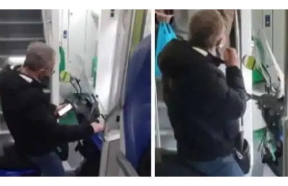 Immortalato dalla video sorveglianza mentre viaggia in treno senza mascherina e, soprattutto, in sella al suo scooter…