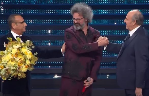 Gerry Scotti, al debutto assoluto all’Ariston: “Nonostante io abbia sempre vissuto all’insegna della semplicità, mi avete fatto sentire importante”. E poi le lacrime di Antonella Clerici quando con i due compagni di viaggio ricorda l’amico Fabrizio Frizzi, “che è qui con noi”.