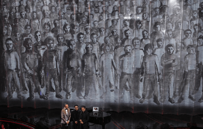 Sul palco dell’Ariston c’è spazio anche per parlare di diritti e morti sul lavoro con Stefano Massini e Paolo Jannacci che arrivano con il brano L’uomo nel lampo.