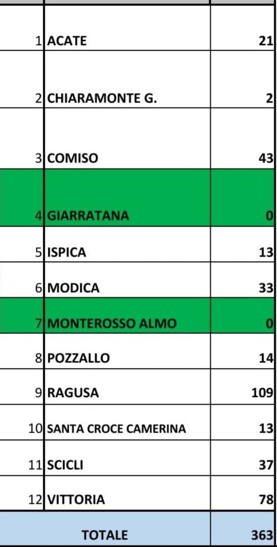 Acate: 21 – Chiaramonte G.: 2 – Comiso: 43 – Giarratana: 0 – Ispica 13 – Modica: 33 – Monterosso Almo: 0 – Pozzallo: 14 -Ragusa: 109 – Santa Croce Camerina: 13 – Scicli: 37 – Vittoria 78.