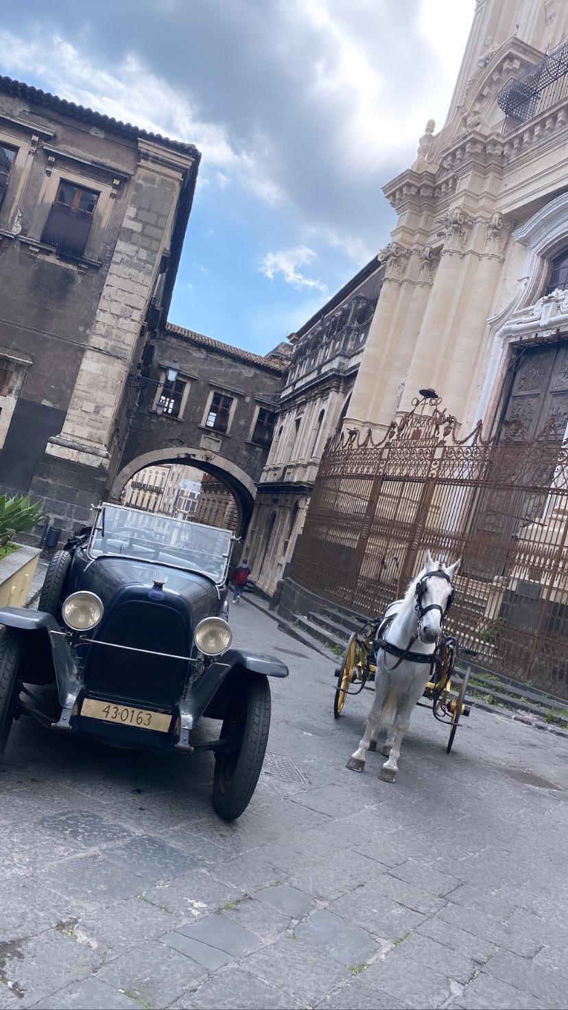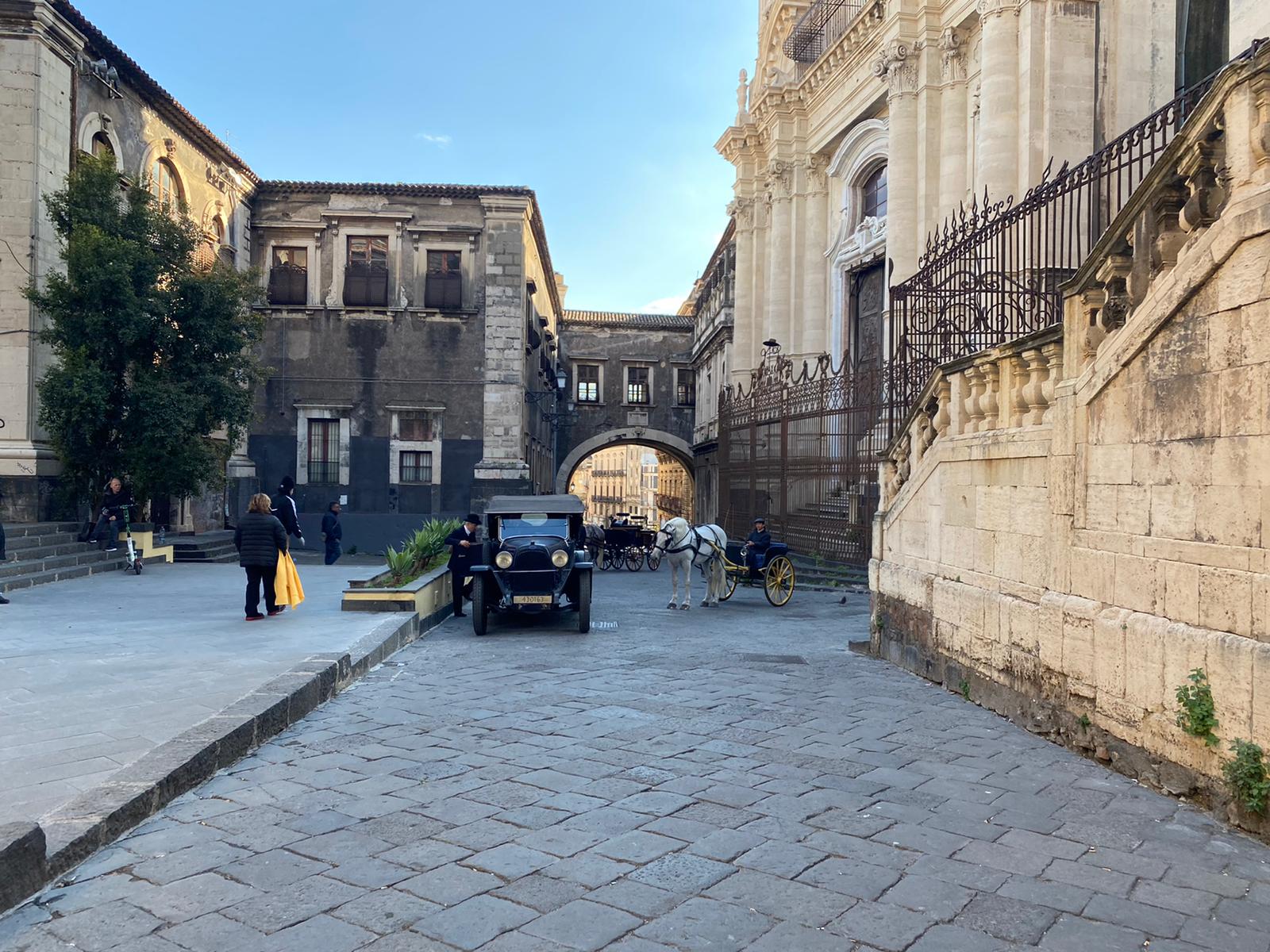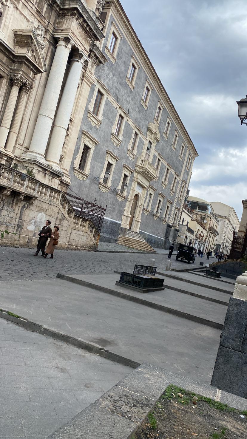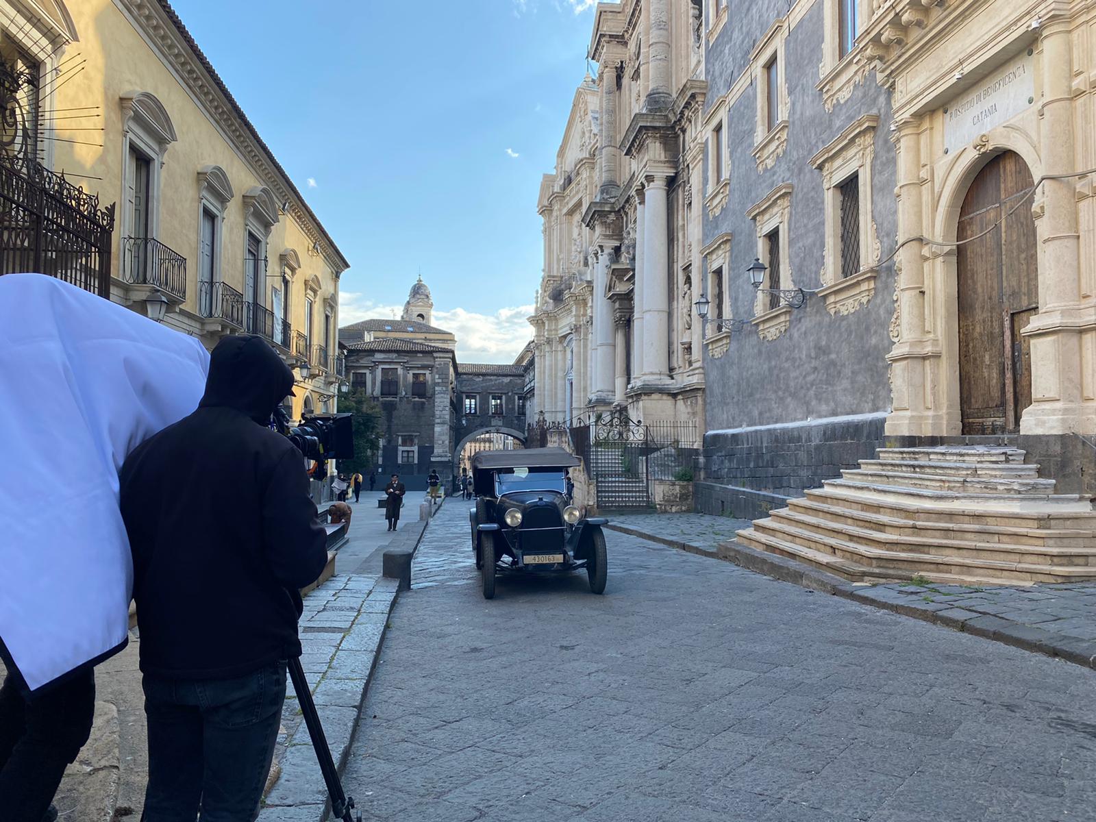 Un luogo ideale per ambientare l’incontro scenico tra due giganti siciliani della letteratura, Luigi Pirandello e Giovanni Verga, come ha sottolineato Santina Cantone, direttrice di produzione. E così la via Crociferi per un giorno è tornata indietro nel tempo, frequentata da donne e uomini agghindati in abiti novecenteschi, attraversata da carrozze e cavalli e qualche auto d’epoca. Il set è stato allestito anche all’incrocio con via Antonino di Sangiuliano, il campo base per i mezzi tecnici in piazza Dante, in prossimità del monastero dei Benedettini. Non solo Roma, Palermo, Erice e Trapani, dunque, per questa importante opera, ma anche un prezioso “cameo” della città che ha dato i natali a una delle illustri “personalità” coinvolte nel film, Giovanni Verga, del quale quest’anno si celebra il centenario.