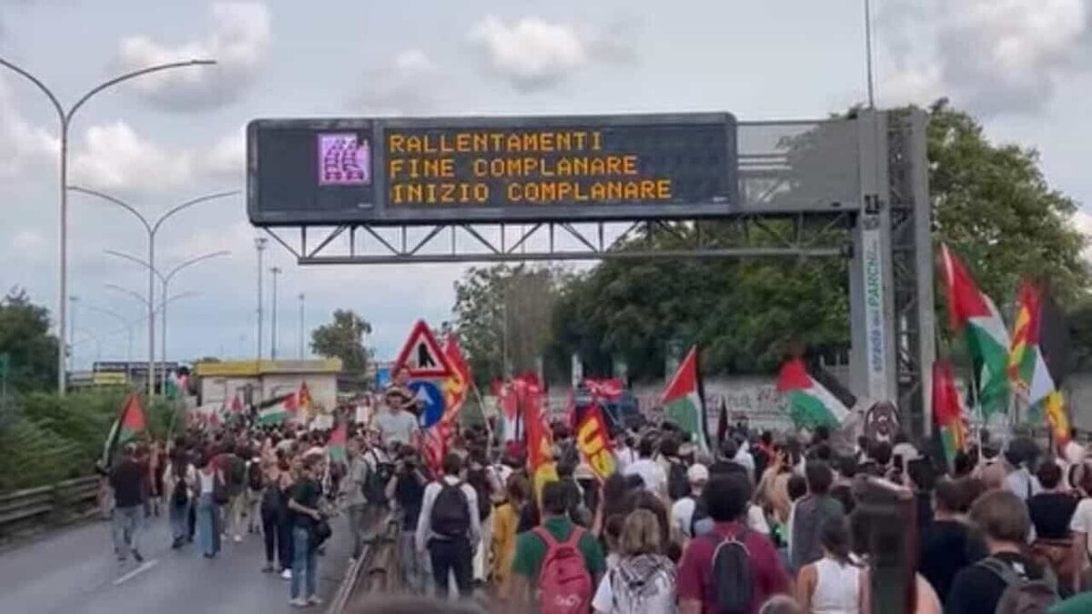 Alcuni manifestanti hanno scavalcato il guard rail della tangenziale, bloccando il traffico e sventolando bandiere palestinesi al grido di “Palestina libera”.