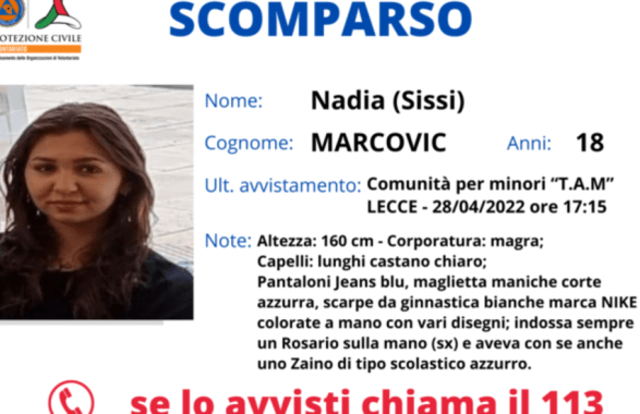 Dopo i diversi casi dei mesi scorsi, ancora una scomparsa nel Salento. Sono ore di apprensione a Lecce, ma in generale in tutto il Salento, per la scomparsa di Nadia Marcovic, meglio conosciuta come Sissi, ragazza di soli 18 anni vista l’ultima volta nel pomeriggio di ieri, intorno alle 17.15, presso la comunità per minori, situata nel capoluogo salentino, Tam. Da giovedì pomeriggio in poi, quindi, è cresciuta l’ansia per la notizia e soprattutto per le sue eventuali condizioni di salute. Proprio oggi la Protezione Civile del coordinamento provinciale di Lecce ha diramato una scheda informativa per chiedere supporto ai cittadini nelle ricerche in caso di avvistamento.
