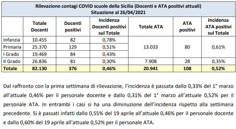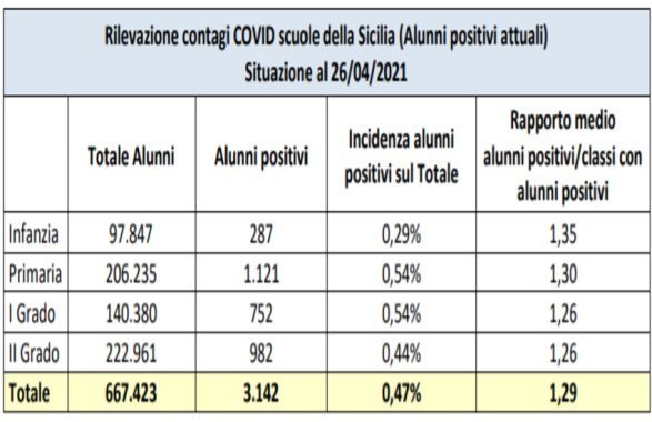 Solo lo 0,47% degli alunni siciliani sono positivi al Covid-19. Lo rivela tramite un comunicato stampa rilasciato sul proprio sito ufficiale l’Ufficio Scolastico Regionale, che riporta i dati raccolti e aggiornati al 26 Aprile 2021 da 786 scuole siciliane (95%).