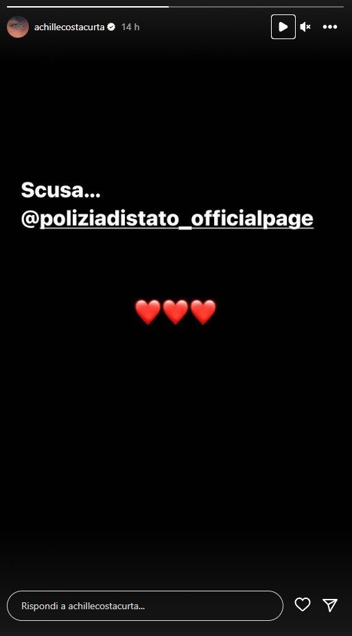 Dopo la notte di follia di Achille Costacurta, arrivano le scuse del figlio dell’ex calciatore Alessandro Costacurta e Martina Colombari. Il ragazzo ha postato una Storia su Instagram in cui invia le sue scuse “minimal” e telegrafiche, con la scritta “Scusa… @poliziadistato_officialpage” accompagnata da 3 cuoricini su sfondo nero.