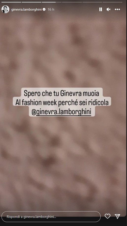 Ginevra Lamborghini attualmente sta lavorando come inviata per Chi Magazine per la Milano Fashion Week, ma in una Storia su Instagram ha raccontato quello che le sta succedendo: “A seguito di alcune dichiarazioni che ho rilasciato a Casa Chi su alcuni giocatori all’interno della casa, sui quali ho dato un mio parere opinabile, potete essere d’accordo e non d’accordo e argomentarlo come volete. Sto ricevendo minacce di morte e offese di ogni tipo, ve ne riporterò una. Questa è una delle tante purtroppo, ma una direi che è abbastanza per rendere l’idea”.