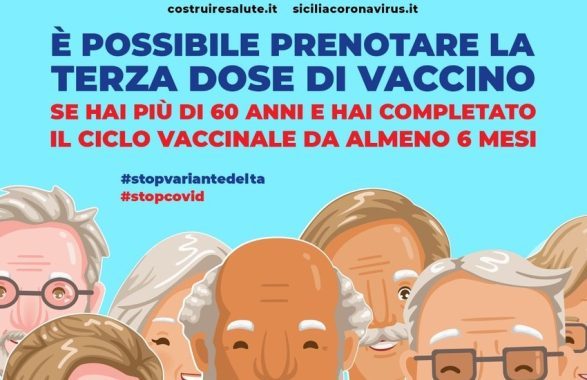 Da oggi, 19 ottobre, in Sicilia è possibile, per gli over 60, vaccinarsi con la terza dose, purché siano trascorsi sei mesi dalla somministrazione della seconda. La prenotazione può essere effettuata, cliccando sull’immagine dedicata, attraverso l’apposita piattaforma della Regione (https://www.siciliacoronavirus.it) o direttamente su quella della Struttura commissariale nazionale gestita da Poste Italiane e raggiungibile al seguente indirizzo: https://prenotazioni.vaccinicovid.gov.it