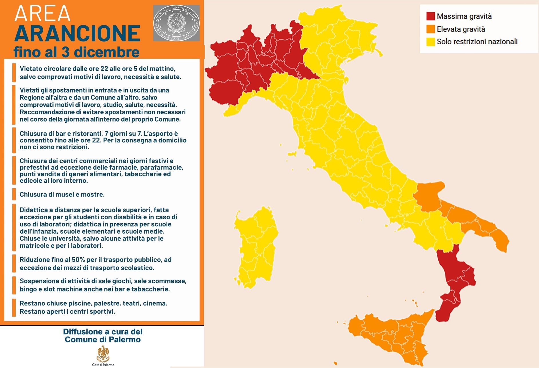 Emergenza Covid: Sicilia dichiarata zona arancione dal 6 novembre in base al nuovo Dpcm, Decreto del presidente del Consiglio. Una scelta dettata non solo dalla diffusione del contagio ma anche dalla situazione sanitaria complessiva. Il provvedimento ha provocato l’opposizione del presidente della Regione Siciliana Nello Musumeci e le critiche del presidente dell’Assemblea Siciliana Gianfranco Miccichè (“La Sicilia muore. Hanno fatto una follia”). Chiede chiarimenti il sindaco di Palermo Orlando.