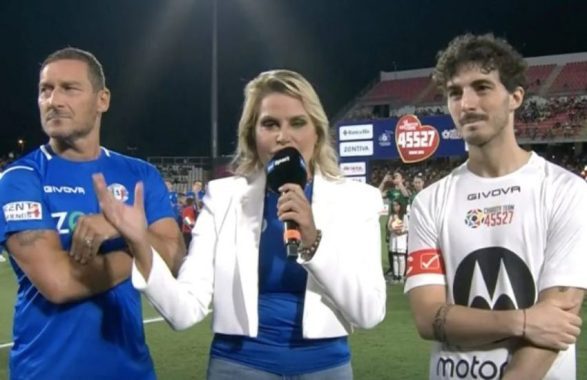L’ex Pupone, apparso in ottima forma, più che gli avversari ha però dovuto dribblare una domanda scomodissima di Simona Ventura, entrata a gamba tesa sull’ex capitano giallorosso proprio prima del fischio iniziale.
