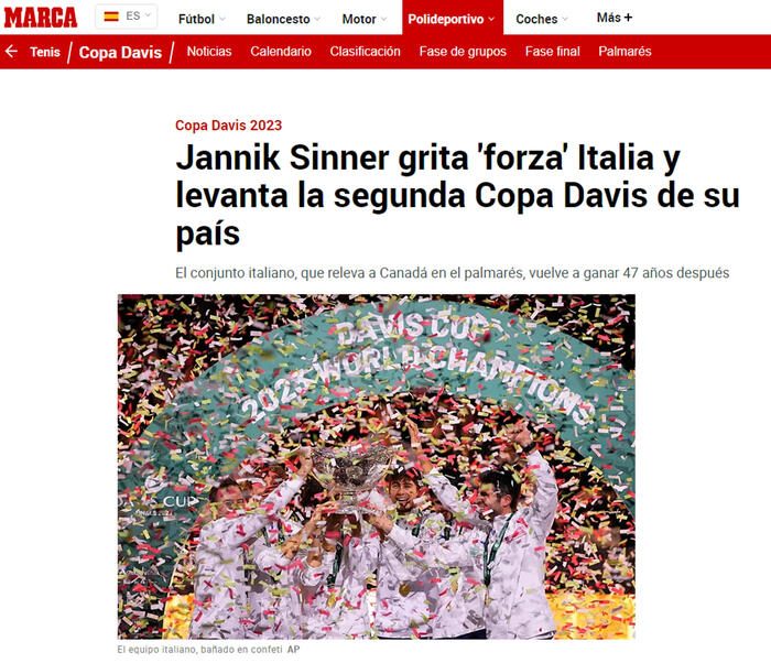 Il sito dello spagnolo Marca sottolinea che “la Federtennis italiana ha investito molti soldi per vedere questa giornata” sotto il titolo “Sinner grida forza Italia e alza la sua prima Coppa Davis”, accompagnandolo con un video celebrativo.