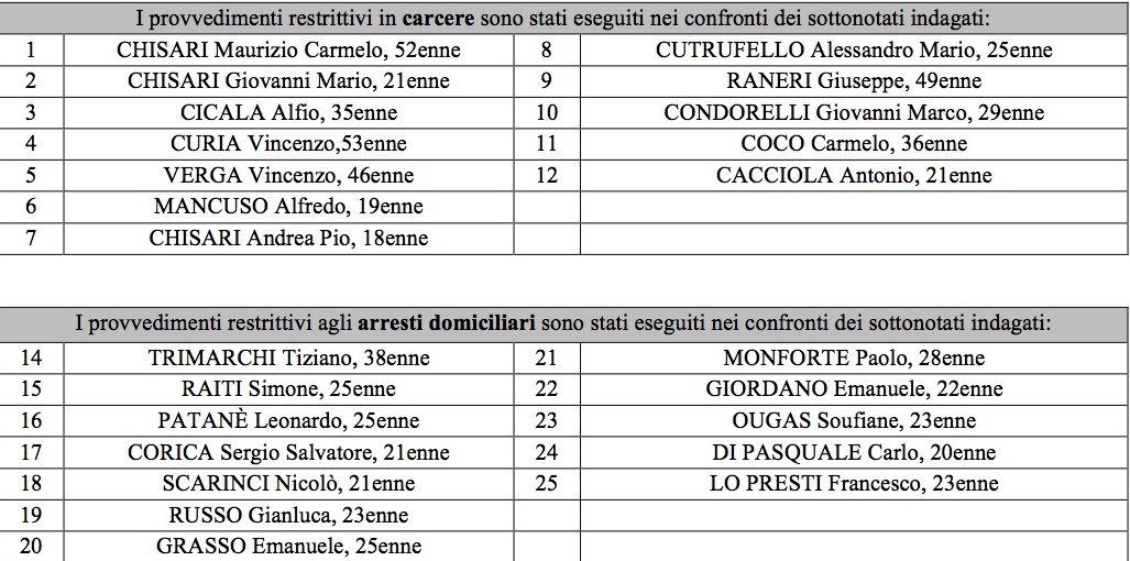 Per il gruppo criminale di Gaggi sono stati raccolti elementi utili a contestare il reato di associazione finalizzata al traffico di sostante stupefacenti a carico di 8 persone, mentre altre 4 persone sono indagate per vari episodi di spaccio. Oltre 30 sono gli episodi di spaccio documentati dai Carabinieri ad opera del sodalizio, diversi dei quali effettuati in favore di minorenni. Il promotore dell’associazione reperiva settimanalmente carichi di cocaina e marijuana da fornitori catanesi che poi venivano smerciati con la collaborazione dei due figli (uno dei quali all’epoca dei fatti minorenne) ed altri pusher stabilmente arruolati. Il sodalizio si serviva della collaborazione di alcuni ragazzi, anche minorenni, che smerciavano lo stupefacente, principalmente marijuana, a loro coetanei e che custodivano la droga ricevendo quale ricompensa, alcune dosi di narcotico per loro uso personale.
