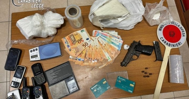 Stessa camera in cui, nascosta tra due cuscini, è stata rinvenuta anche una pistola calibro 7.65 con matricola abrasa completa di caricatore e relativo munizionamento. Nella sala da pranzo, invece, all’interno di un mobile, sono stati rinvenuti quasi 750 grammi di sostanza da taglio presumibilmente del tipo mannite oltre a due bilancini di precisione e materiale vario per il confezionamento. L’uomo infine è stato trovato in possesso di quasi 2.000 euro in banconote di vario taglio. Somma ritenuta presumibile provento dell’attività di spaccio nel Salento. Il tutto è stato sottoposto a sequestro e messo a disposizione dell’autorità giudiziaria. Al termine delle operazioni di polizia l’uomo è stato arrestato per spaccio nel Salento e, come disposto dal P.M. di turno presso la Procura della Repubblica di Lecce che conduce le indagini, tradotto presso Casa Circondariale Borgo San Nicola del capoluogo salentino.