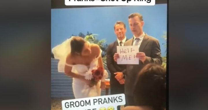 A quel punto lo sposo tira fuori un foglietto dove però, al posto delle promesse, c’è scritto “Help me!”, cioè aiutatemi. Come si vede nel video che spopola sui social la sposa inizialmente non capisce ma poi, dopo aver letto la scritta, fa una faccia sorpresa e offesa, tanto da colpire lo sposo con il bouquet sul braccio ma con delicatezza e col sorriso sulle labbra, segno che tutto sommato ha accettato lo scherzo.