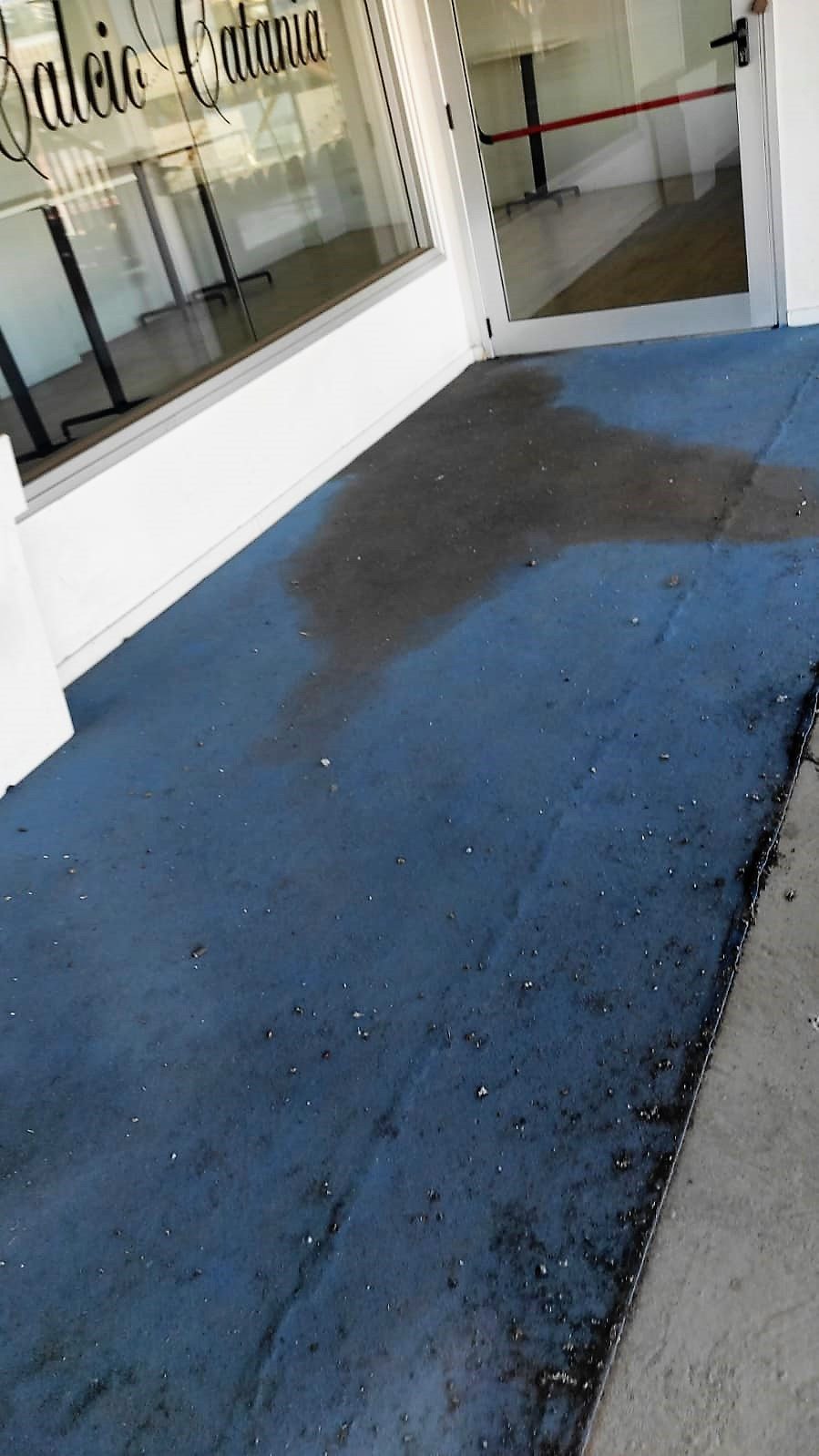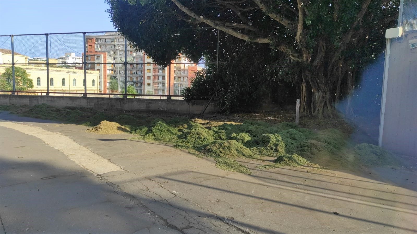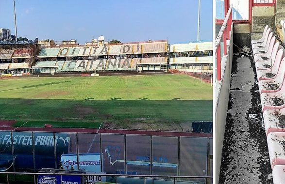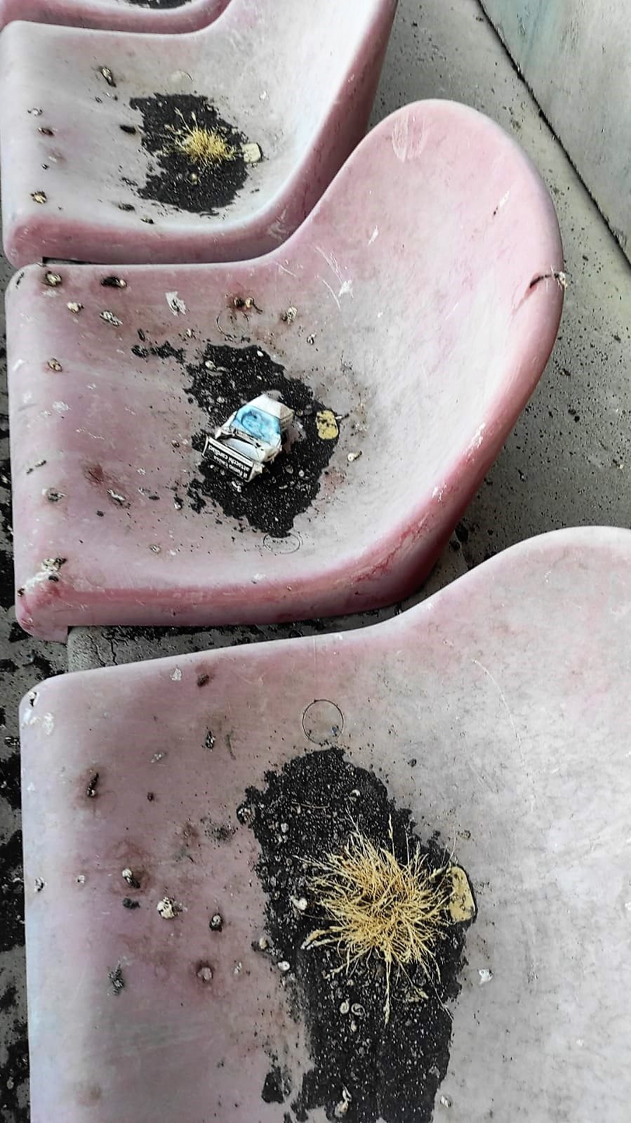 Sui sedili, e non soltanto, c’è ancora accumulata la cenere vulcanica piovuta sulla città dall’Etna. E’ stata lasciata lì a depositarsi insieme con rifiuti di altro genere.
