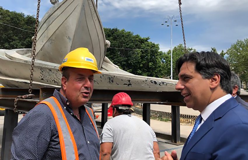 Una grande gru con lunghi e possenti cavi d’acciaio ha tirato la fontana monumentale de “I Malavoglia”, realizzata