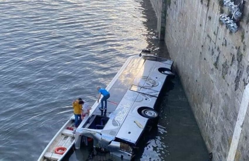 Un autobus turistico in retromarcia ha sfondato il parapetto e si è inabissato nelle acque