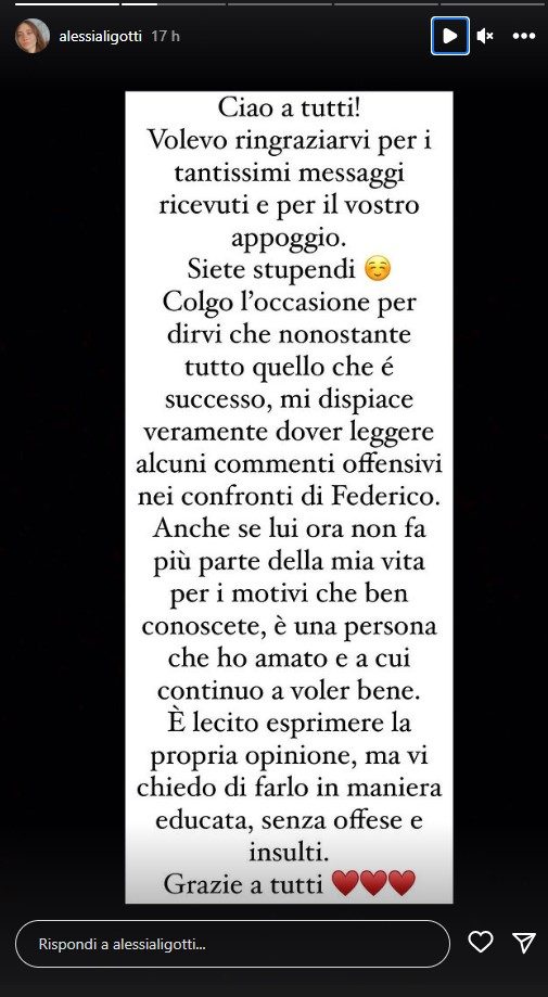 Dopo questa “introduzione” Alessia ha poi chiesto ai suoi fan di usare toni più pacati: “Colgo l’occasione per dirvi che nonostante tutto quello che è successo, mi dispiace veramente dover leggere alcuni commenti offensivi nei confronti di Federico. Anche se lui ora non fa più parte della mia vita per i motivi che ben conoscete, è una persona che ho amato e a cui continuo a voler bene. È lecito esprimere la propria opinione, ma vi chiedo di farlo in maniera educata, senza offese e insulti”.