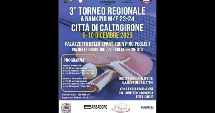 Sabato 9 e domenica 10 dicembre – apertura dell’impianto alle 8, inizio delle gare in entrambe le giornate alle 9,30 – il Palazzetto dello sport “Don Pino Puglisi”, in via delle Industrie 27, ospiterà il 3° torneo regionale di tennistavolo a ranking M/F 23-24 “Città di Caltagirone”, che vedrà la partecipazione delle migliori racchette siciliane.