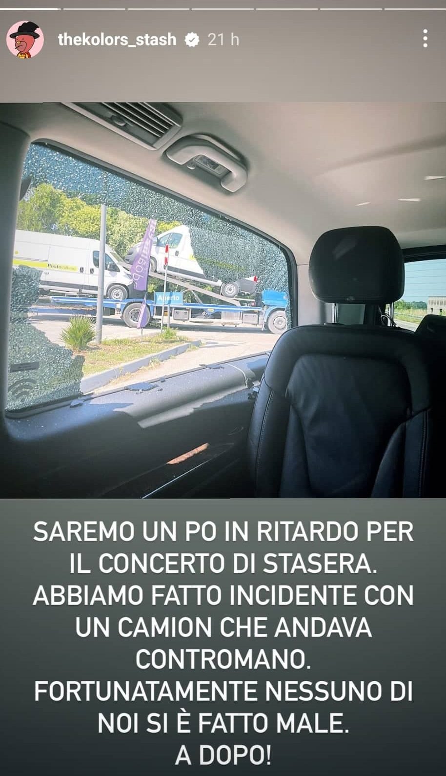 Nel video è possibile vedere i vetri frantumati del van all’interno del quale i The Kolors viaggiavano e sullo sfondo si vede anche un camion bisarca. Quanto accaduto, oltre a non aver provocato gravi conseguenze, non ha comunque compromesso lo svolgimento per il concerto della band formatasi nel 2010 e divenuta famosa nel 2015 grazie alla partecipazione al talent show Amici di Maria De Filippi.