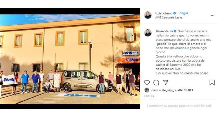 Nell’ultimo post sul suo profilo Instagram, Tiziano Ferro mostra, orgoglioso, l’immagine di una auto che sosta davanti alla sede dell’Avis di Latina.