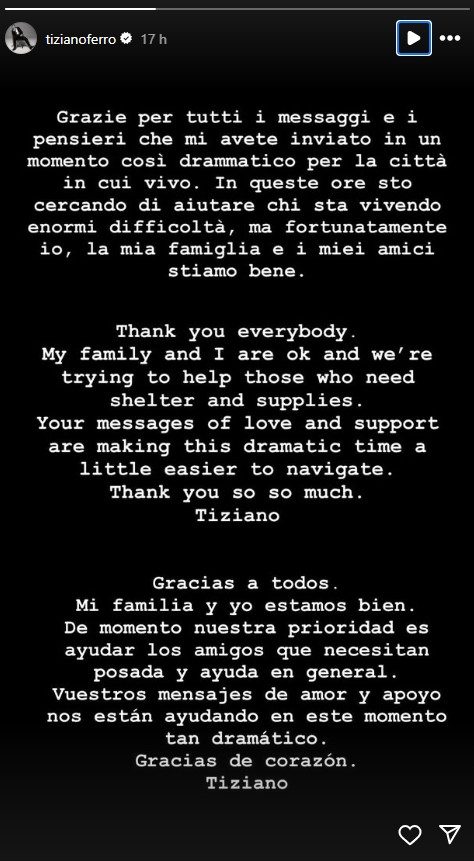 Tiziano Ferro, che ha divorziato dal marito Victor Allen da oltre un anno, è tornato a scrivere sui social dopo un lungo periodo di silenzio, rassicurando i suoi fan sulle sue condizioni: “Grazie per tutti i messaggi e i pensieri che mi avete inviato in un momento così drammatico per la città in cui vivo. In queste ore sto cercando di aiutare chi sta vivendo enormi difficoltà, ma fortunatamente io, la mia famiglia e i miei amici stiamo bene”. Parole tradotte anche in inglese e in spagnolo che hanno fatto tirare un sospiro di sollievo ai fan, che si chiedevano come stesse Tiziano Ferro e i suoi figli Margherita e Andres.