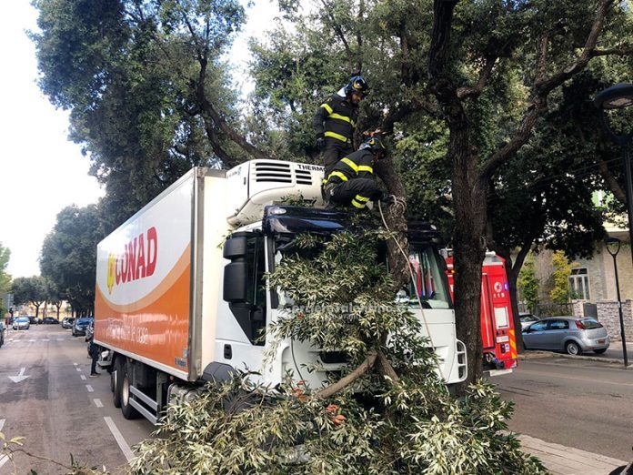Il ramo, forse spezzatosi per il forte vento, è andato a finire contro il grosso camion che trasportava derrate per una grossa e famosa catena di supermercati. Il ramo ha sfondato il parabrezza del mezzo pesante ma, per fortuna, non ha provocato feriti. Illesi gli occupanti del camion o le altre persone che transitavano nei paraggi. Sul posto della tragedia sfiorata in pieno centro sono intervenuti i Vigili del Fuoco del Comando provinciale di Lecce che hanno provveduto a rimuovere il ramo staccatosi di netto senza che il mezzo vi impattasse ed a rimettere in sicurezza la zona.