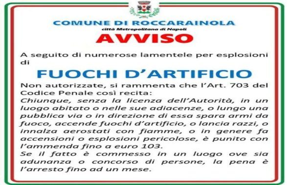 Il Comune di Roccarainola, in seguito alle numerose lamentele di diversi cittadini relativi alle esplosioni non autorizzate di fuochi d’artificio, ha rilasciato un avviso sulla sua pagina Facebook.