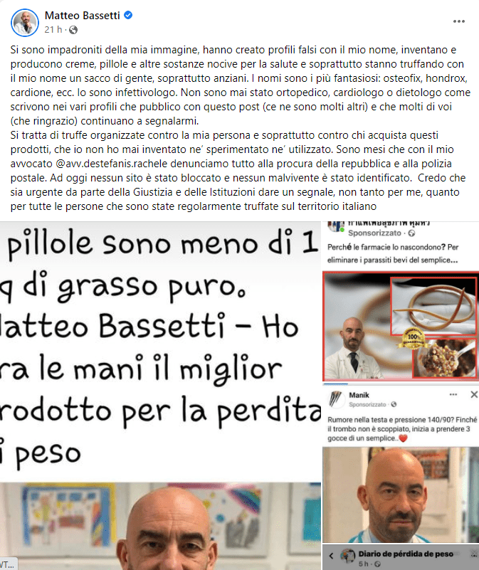 “Si sono impadroniti della mia immagine – esordisce Bassetti nel suo post – hanno creato profili falsi con il mio nome, inventano e producono creme, pillole e altre sostanze nocive per la salute e soprattutto stanno truffando con il mio nome un sacco di gente, soprattutto anziani. I nomi sono i più fantasiosi: osteofix, hondrox, cardione, ecc.”.