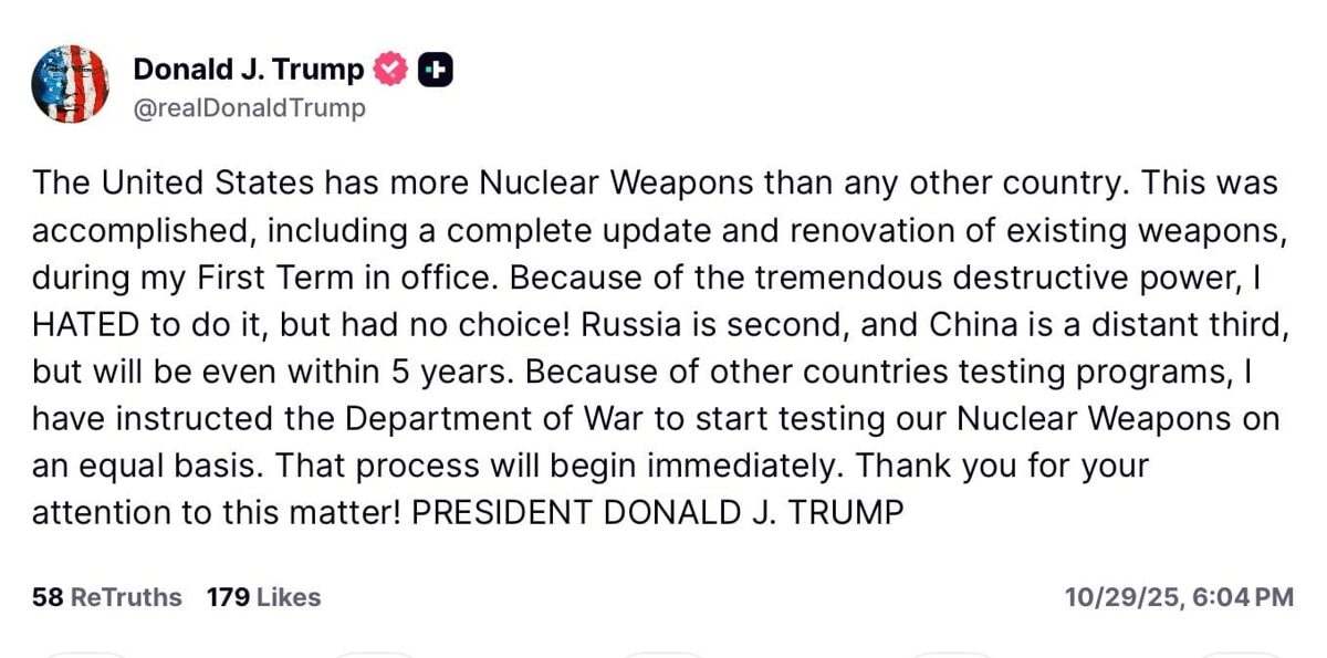 Trump ha reso noto di aver ordinato al Dipartimento della Difesa di avviare nuovi test nucleari, spiegando su Truth Social: “A causa dei programmi di test di altri Paesi, ho incaricato il Dipartimento della Guerra di iniziare a testare le nostre armi su base paritaria”.