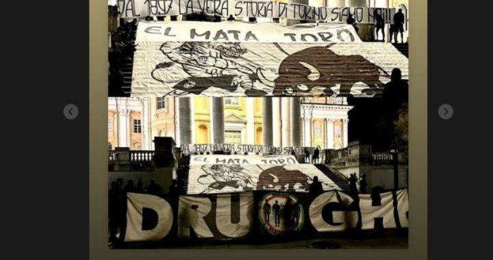 Questa notte i Drughi, gruppo storico di tifosi della Juventus, hanno esposto ai piedi della chiesa uno striscione dove c’era scritto “Dal 1897 la vera storia di Torino siamo noi”. Sotto c’era un altro striscione con un grosso disegno sopra dove campeggiava una zebra che infilza un toro con la scritta “El Mata Toro”.