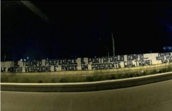 C’è grande agitazione in casa Napoli, o meglio, in una parte della tifoseria azzurra. Nella notte è comparso uno striscione firmato Fedayn contro il presidente De Laurentiis che recitava così: “Al trionfo preferisce il portafoglio gonfio… La nostra vessazione è avere un presidente cialtone”.