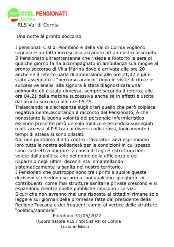 I pensionati Cisl di Piombino e della Val di Cornia vogliono segnalare un fatto increscioso accaduto ad un nostro associato. Il Pensionato ultraottantenne che risiede a Riotorto la sera di qualche giorno fa ha accompagnato in ambulanza sua moglie al pronto soccorso di Villa Marina dove è arrivata alle ore 20 anche se il referto parla di ammissione alle ore 21,07 e gli è stato assegnato il “percorso arancio” dopo le visite di rito e le successive analisi alla signora è stata diagnosticata una polmonite ed è stata dimessa, sempre secondo il referto, alle ora 04,21 della mattina successiva anche se in effetti è uscita dal pronto soccorso alle ore 05,45.