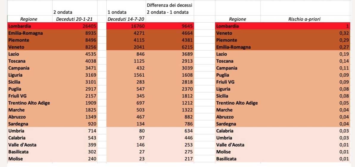 Lo studio, già online dall’aprile 2020 in versione preprint, attraverso una nuova metodologia, è riuscito a stimare il rischio apriori dell’impatto della pandemia da Covid-19 nelle varie regioni italiane tenendo in considerazione diversi cofattori che permettono di capire il perché della differente incidenza della pandemia sul territorio italiano – spiegano i ricercatori -. In questa maniera le regioni italiane sono state classificate in quattro diversi gruppi di rischio (molto alto, alto, medio e basso) e la graduatoria così stilata predice molto bene quello che è avvenuto realmente durante la prima e la seconda ondata di contagi e riesce a dare una spiegazione razionale e oggettiva del perché la regione a rischio maggiore sia proprio la Lombardia (rischio molto alto) seguita da Veneto, Piemonte ed Emilia Romagna (fascia di rischio alto) ovvero da quelle regioni che, secondo i dati ufficiali dei decessi e delle terapie intensive, sono state maggiormente colpite dal Covid-19».