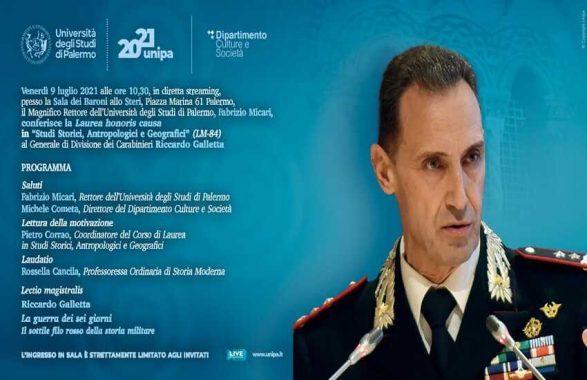 Domani Venerdì 9 Luglio, alle 10:30 presso Palazzo Steri a Palermo si svolgerà la cerimonia di conferimento della Laurea honoris causa in Studi storici, Antropologici e Geografici al Generale di Divisione Riccardo Galletta, già Comandante dal 2015, della Legione Carabinieri “Sicilia”.